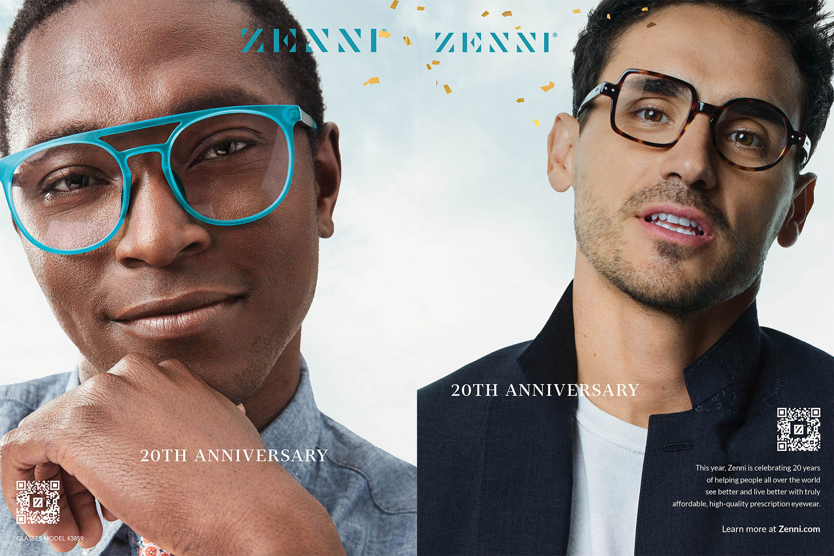 To mark Zenni’s 20th anniversary and their milestone of 50 million pairs sold, we partnered with the brand to develop a series of creative campaigns and redesigned print ads. The new look, which appeared in Hemispheres magazine, was minimalistic and sophisticated.